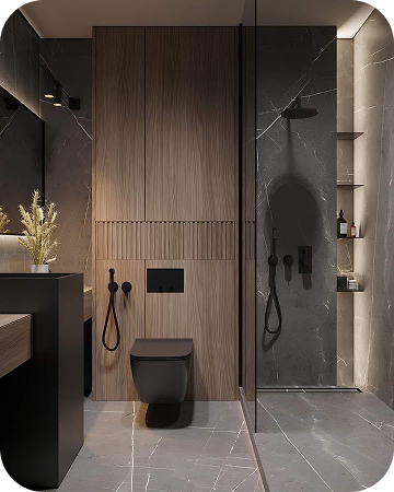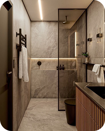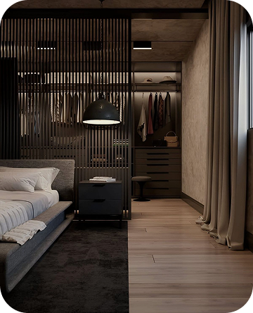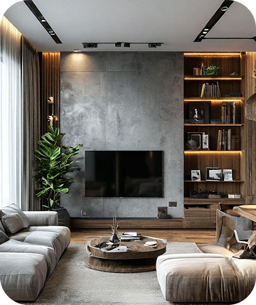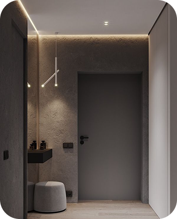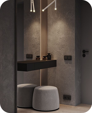 Интерьеры выполнены в тёплой палитре белых и бежевых оттенков с вкраплениями древесной текстуры. Лаконичные формы, приглушённый свет, текстиль из натуральных тканей, и ручная работа в деталях создают атмосферу уюта и покоя.