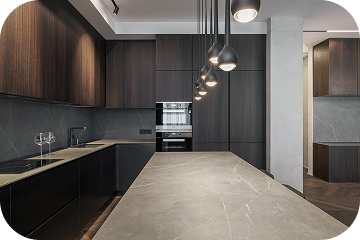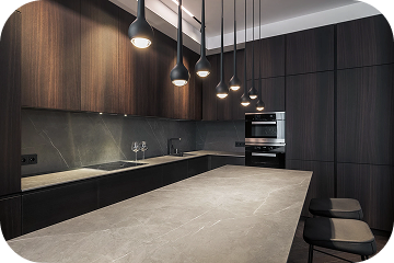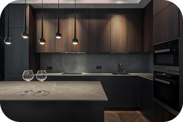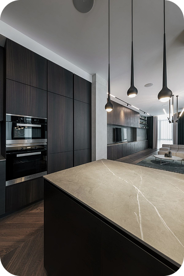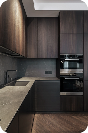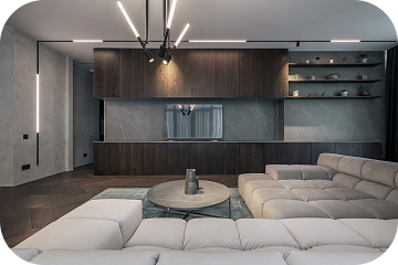Интерьер выполнен в нейтральных тёплых тонах: коричневый, серый, бежевый. Акцент на текстуре: дерево, камень, матовый металл. Минимум декора - максимум атмосферы.