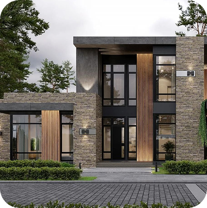 Фасады облицованы натуральным камнем, тёмным деревом и чёрным металлом. Остекление открывает вид на сад, а простая геометрия подчёркивает монолитность объёма.