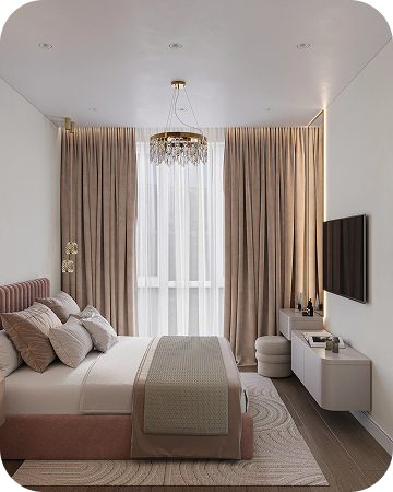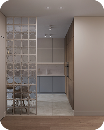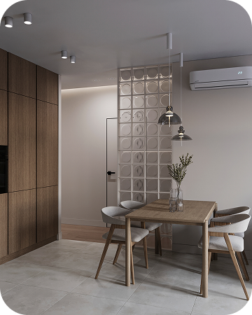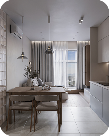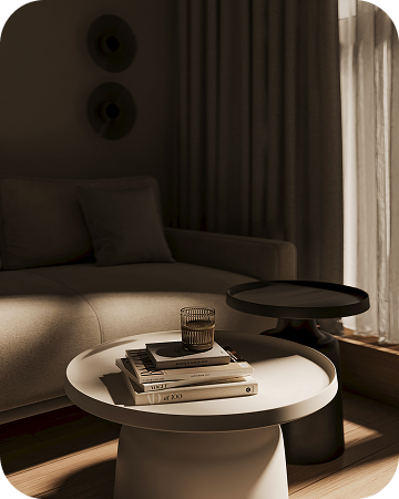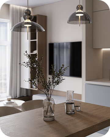 Интерьеры выполнены в тёплой бежевой гамме. Акценты — в натуральных материалах: дерево, мягкий камень, текстиль. Всё лишнее убрано, остаётся только чистая форма и ощущение уюта.